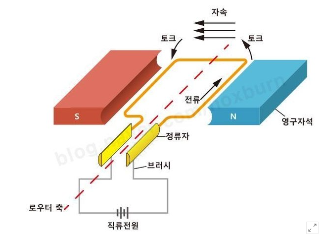 입력측(정류자 쪽)에서 출력측(구동부와 연결되는 쪽)으로 움직이는 전류는 코일을 위로 움직이게 하고 다시 반대로 돌아오는 코일은 아래쪽으로 움직이게 하여 축을 회전 시킵니다.