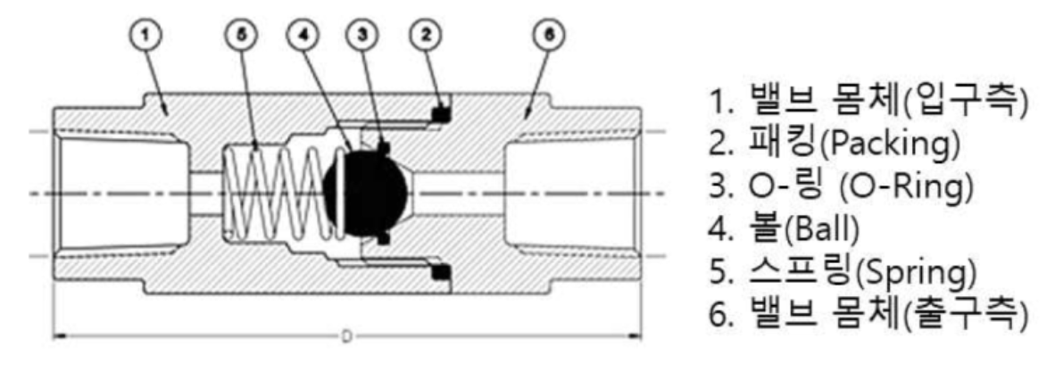 유체가 반대로 흐를 경우, 스프링은 장력으로 원위치로 돌아오게 되며 볼과 오링으로 입구가 밀폐되어 역류를 방지하게 됩니다.