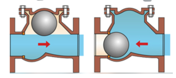 유체가 정상적으로 흐를 경우 아래와 같이 볼이 떠있어 흐름이 방해되지 않고, 반대로 흐를 경우 내부 구조에 의해 볼이 막히게 되어 역류가 방지되게 됩니다.