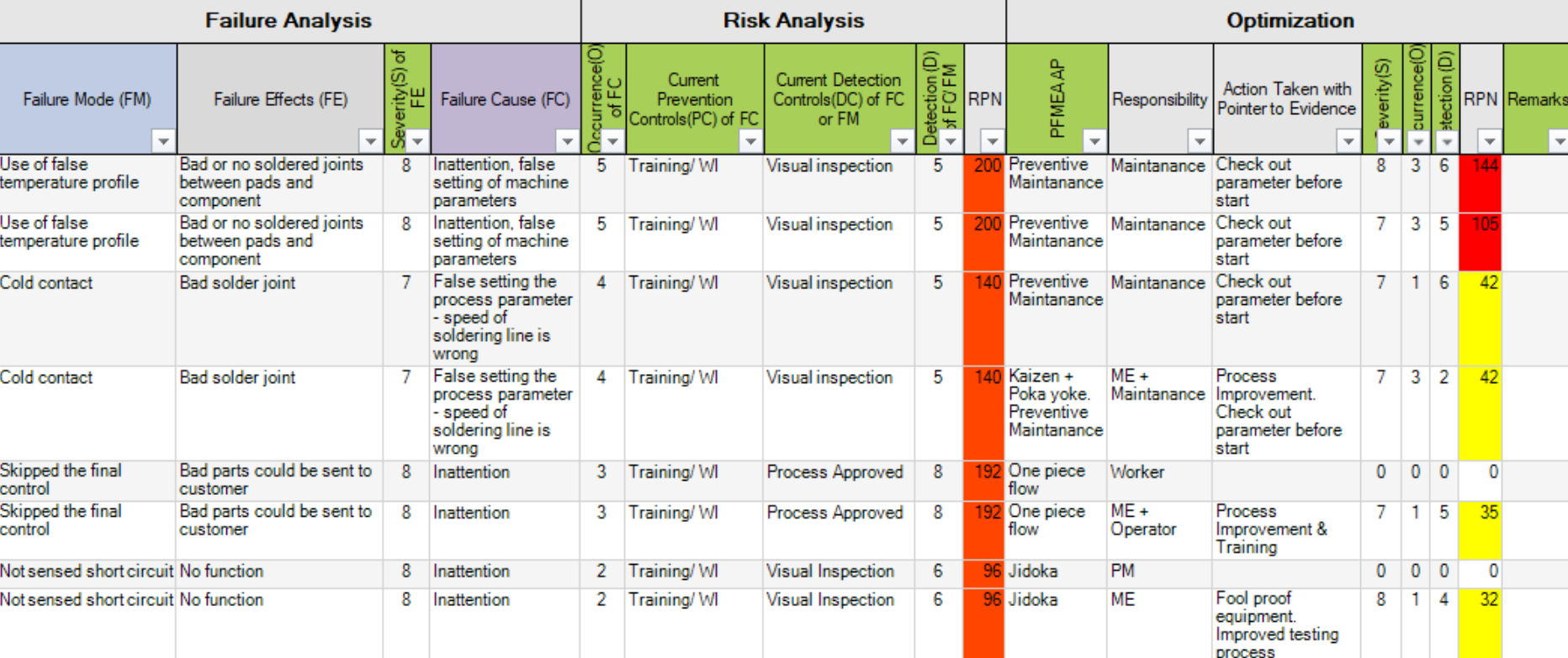 7. 개선활동을 한 후 수정된 RPN으로 PFMEA가 완성됩니다.