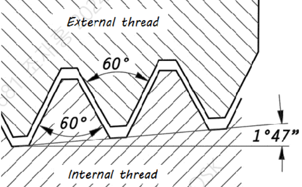 NPT는 National Pipe Tapered의 줄임말로 경사가 있는 나사를 의미합니다. 나사의 경사는 1º 47′ 정도로 테이퍼링 되어 있으며, 나사산의 각도는 60º입니다.